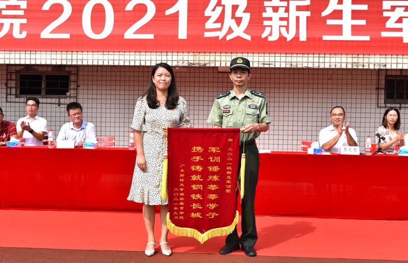 吕瑛经理代表学院向承训部队赠送锦旗,向11天来默默付出的教官表示感谢。
