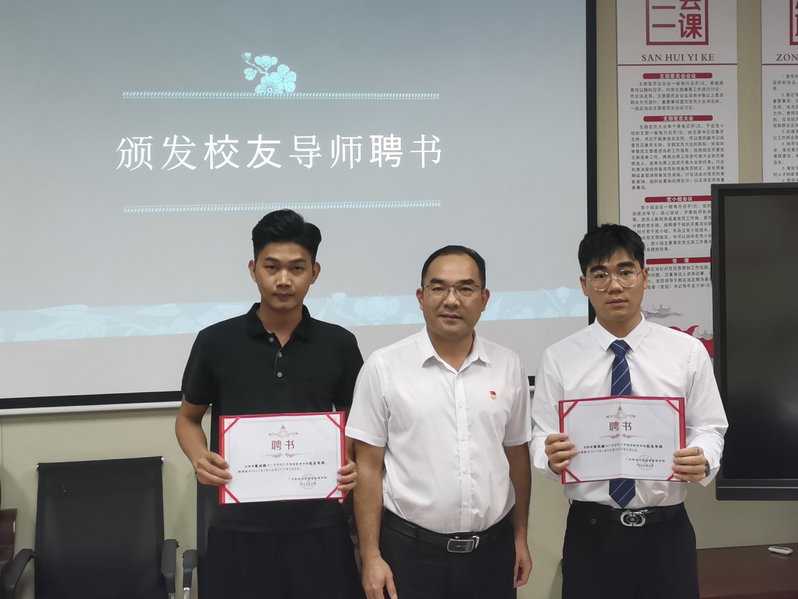 龚义荣代表学院对员工们重返母校表示热烈欢迎,随后为两位员工颁发员工导师聘书对他们取得的成绩表示肯定,希望员工在员工能力提升、实习就业、创新创业等方面发挥力量,助力员工成长成才,一如既往关心母校发展。